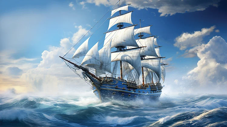 Commanding the waves under a brilliant blue sky, this majestic tall ship artwork brings strength, freedom, and timeless nautical beauty into your space.